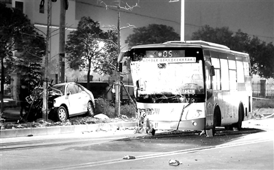 當(dāng)晚10時(shí)許,黃石理工學(xué)院中門(mén)段發(fā)生一起車(chē)禍,一輛轎車(chē)和一輛5路公交車(chē)相撞,小轎車(chē)右前輪被撞斷,公交車(chē)車(chē)頭嚴(yán)重變形,F(xiàn)場(chǎng)有兩具尸體,地上散落著汽車(chē)零部件和血跡。