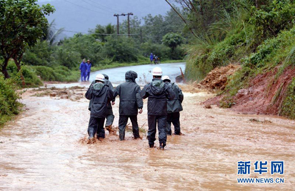 10月4日,通往吊羅山林區(qū)山體滑坡現(xiàn)場的道路上,洪水從山上流下。當日8時20分左右,距海南省陵水縣吊羅山林區(qū)山體滑坡現(xiàn)場約8公里處的山區(qū)突發(fā)山洪,通往吊羅山林區(qū)的唯一救援道路被堵塞。經(jīng)過當?shù)赜嘘P部門與武警消防部隊的緊急搶修,9時20分左右,大型車輛與越野車輛可以通過。新華社記者 侯建森攝