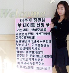 在位于首爾世宗路的政府中央大樓后門,經(jīng)常出現(xiàn)各社會團體的擴音器聲音和橫幅。但本月18日,一名身穿黑色正裝、手拿鮮花和粉紅色牌子的20多歲女性出現(xiàn)在此處。這位被稱為韓國“最美抗議者”的女子最終打動了教育長官,使得她的問題得到解決。