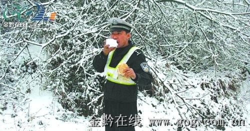在網(wǎng)上一組專題報(bào)道中,標(biāo)題為《貴州遵義交警抗凝凍,啃雪堅(jiān)守崗位》的系列照片,引起了網(wǎng)民關(guān)注。其中有交警在道路上設(shè)卡值勤,也有交警幫過往司機(jī)推車的情景,而一張交警“啃雪”吃面包的照片,尤其讓人印象深刻,至今已有1108條評(píng)論。記者注意到,照片中的交警臉被凍得通紅,他左手拿著面包,右手拿著一團(tuán)雪,正放在嘴里啃。