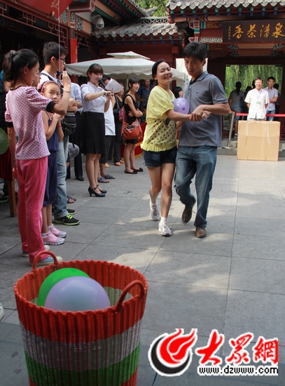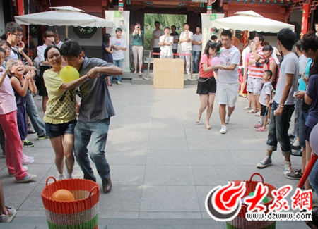 “乞巧”結(jié)束后,接下來進(jìn)行的是“夫妻雙雙把家還”的活動(dòng)。這個(gè)活動(dòng)需要情侶或夫妻協(xié)作完成,采用兩兩PK的形式。一組選手雙方用胸口頂住氣球,將氣球從小院的一頭運(yùn)送到另一頭的竹筐內(nèi)。在5分鐘里運(yùn)送氣球最多的一方勝出。參賽的情侶中,張志鵬和王姣姣這對(duì)是燕山大學(xué)的大三在校生。在比賽中,這對(duì)情侶配合默契,5分鐘運(yùn)送了29個(gè)氣球,輕松擊敗對(duì)手。