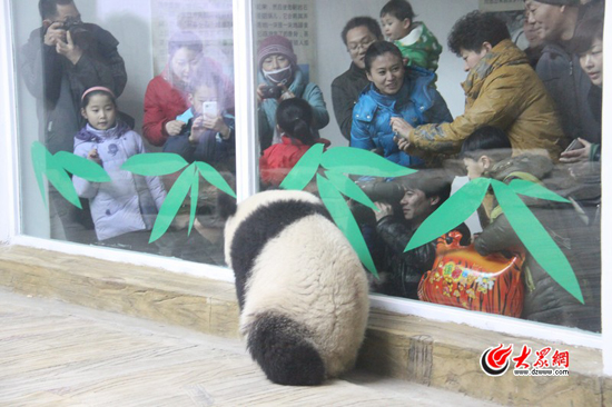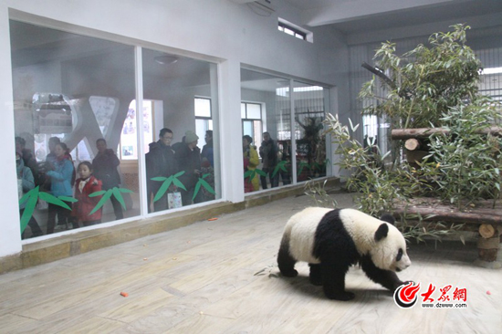 大眾網(wǎng)濟(jì)南2月6日訊(記者 赫洋 韋輝)今天上午,濟(jì)南市動物園大熊貓新館正式開館納客,兩只剛剛從四川臥龍碧峰峽基地引進(jìn)的大熊貓也第一次與濟(jì)南市民見面。為了一睹“國寶”的風(fēng)采,不少前來參觀的市民都特意起了個大早。而兩個小家伙也十分“給面子”,一會打滾,一會玩“倒立”,絲毫都不“認(rèn)生”。