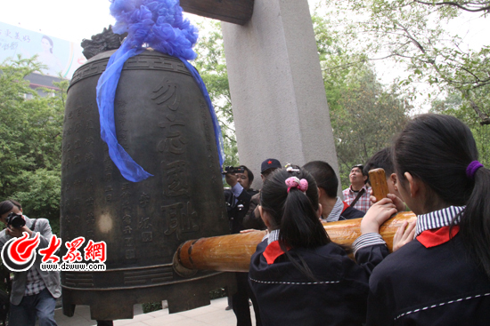 趵突泉小學(xué)的學(xué)生們撞響紀(jì)念鐘
