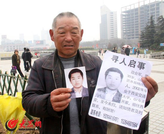 大眾網(wǎng)濟(jì)南3月20日訊(記者 尹海洋 盛堃)“段會軍,快點(diǎn)回家吧,你走了7年了,我跟你娘都很想你……”今天上午,一位白發(fā)老人在濟(jì)南泉城廣場面對大眾網(wǎng)記者的鏡頭哭訴,老人來自臨沂市沂水縣楊莊鎮(zhèn)躲莊村,來到濟(jì)南,只為尋找他離家出走7年的兒子段會軍——畢業(yè)于西安交大的高材生。