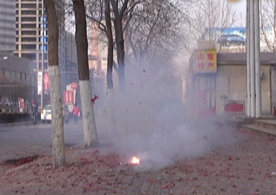 解說(shuō):記者在街頭看到,商家在放開(kāi)門(mén)炮時(shí),不少市民都繞著走,另外,站在高處遠(yuǎn)遠(yuǎn)望去,濟(jì)南上空被一片煙霧籠罩,這些都是煙花爆竹惹的禍。不少市民對(duì)于開(kāi)門(mén)炮的燃放也有自己的看法。