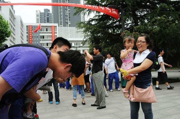 “出來了!出來了!”隨著考試結(jié)束鈴聲的響起,有不少考生開始往校門口走來。在外等候的人群中也響起陣陣掌聲,向剛剛走出“戰(zhàn)場(chǎng)”的考生們致敬。