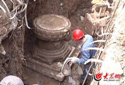 大眾網(wǎng)濟(jì)南12月2日訊(記者 韋輝 盛堃)11月23日,濟(jì)南市縣西巷一電纜施工現(xiàn)場(chǎng)發(fā)現(xiàn)佛教經(jīng)幢底座引起了社會(huì)各界的關(guān)注。經(jīng)過(guò)幾天的現(xiàn)場(chǎng)發(fā)掘,12月2日下午,濟(jì)南市考古研究所正式對(duì)這個(gè)經(jīng)幢底座進(jìn)行起吊挖掘。由于歷史原因,這個(gè)經(jīng)幢底座最上面一層已經(jīng)斷裂。另外,由于體積和重量較大,考古人員采取了分段起吊。截止下午五點(diǎn),底座最上面的一塊圓形凹槽被起吊完畢,剩下的經(jīng)幢底座將于3日繼續(xù)挖掘。