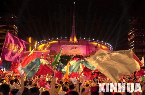 資料圖片:2001年7月13日,國際奧委會第112次全會投票選出2008年奧運會主辦城市——中國北京。這一天的晚上,北京城一片歡騰。這是中華世紀壇前歡呼的人群。 新華社發(fā)