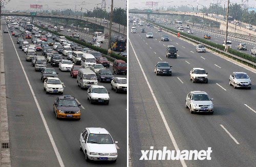 資料圖片:左圖和右圖分別為2007年8月16日8時許和2007年8月17日8時許在北京東四環(huán)小武基橋拍攝的車流。 2007年8月17日,北京開始實行為期四天的機動車單雙號出行交通限行措施。新華社發(fā)