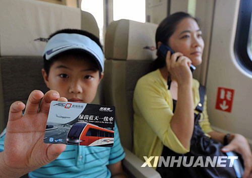 7月19日,首批乘坐機場快軌的于詩洋小朋友在去機場途中展示車票。新華社記者羅曉光攝