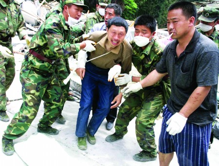 王友誼是德州消防支隊的隊長,他帶領(lǐng)著手下40個來自德州的救援隊員,15日上午10時剛到小漁洞鎮(zhèn),就有村民說董坪村有人在地震中被困,于是12名隊員涉水進入這個村子。兩個小時后,他們在一片簡易棚的廢墟中找到了被困的80多歲的黃玉珍大娘。王隊長告訴記者,老人頭部和頸骨受傷,耳朵中流出的鮮血都結(jié)成了塊,神志有些恍惚,但她能在受傷狀態(tài)下堅持70個小時,可以算得上奇跡了。