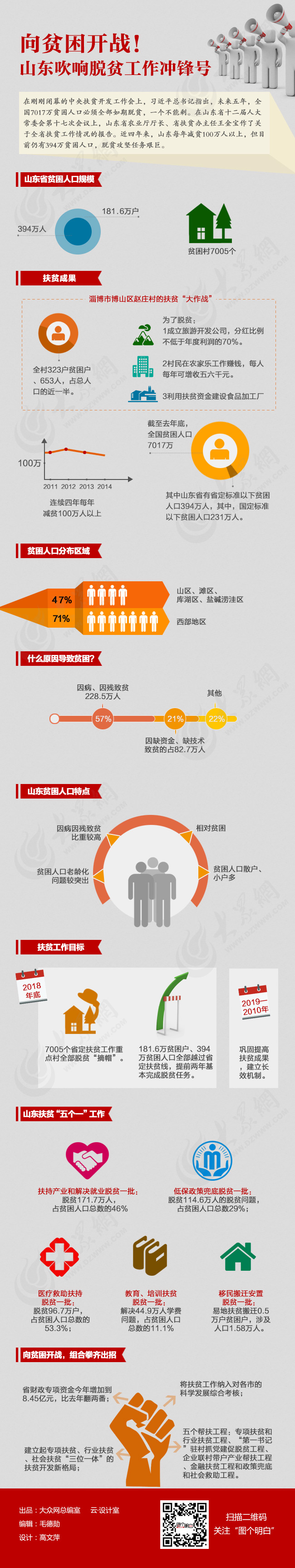 為完成2018年全省全部脫貧的目標(biāo),山東將推進(jìn)“五個一批”工作向貧困“宣戰(zhàn)”,即通過扶持產(chǎn)業(yè)和解決就業(yè)脫貧一批;通過低保政策兜底脫貧一批;通過醫(yī)療救助扶持脫貧一批;通過教育、培訓(xùn)扶貧脫貧一批;通過移民搬遷安置脫貧一批,主要解決符合國家有關(guān)規(guī)定、有意愿進(jìn)行易地扶貧搬遷貧困戶的脫貧問題。