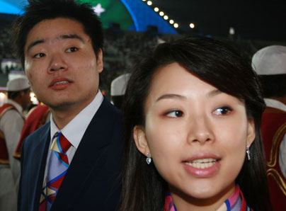 多哈時間12月1日消息 在開幕式運動員進場前。圖為潘曉婷與丁俊輝。(沈?qū)? |