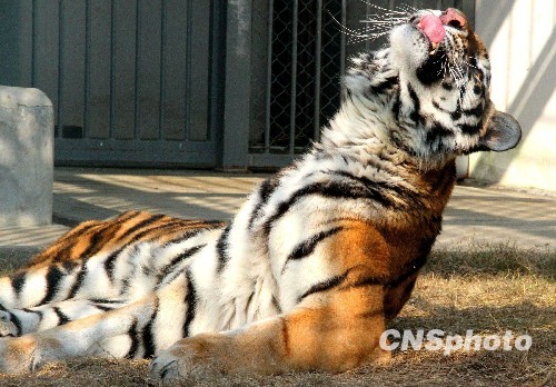 2010年1月6日,江蘇蘇州盡管寒氣襲人,蘇州動物園猛獸觀賞區(qū)一只3歲東北虎時而漫步游逛,時而坐臥躺歇,活潑可愛的虎姿與神態(tài)各異的“表情”為市民游客增添了不少情趣。中新社發(fā) 王建中 攝