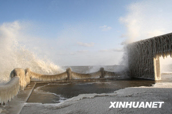 2月12日,煙臺市東炮臺旅游碼頭掛滿海水冰凌。持續(xù)3天的大風(fēng)和低溫天氣使山東省煙臺市海濱出現(xiàn)冰凌美景,綿延數(shù)公里,蔚為壯觀。新華社發(fā)(申吉忠 攝)