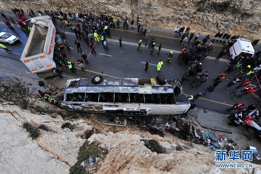 這是2月16日在耶路撒冷以北的亞當(dāng)猶太人定居點(diǎn)附近拍攝的車(chē)禍現(xiàn)場(chǎng)。當(dāng)日,在耶路撒冷以北的亞當(dāng)猶太人定居點(diǎn)附近發(fā)生一起車(chē)禍,據(jù)當(dāng)?shù)孛襟w報(bào)道,事故至少造成8人死亡,40余人受傷。記者在現(xiàn)場(chǎng)看到,發(fā)生事故的是一輛大型卡車(chē)和客車(chē),兩車(chē)車(chē)頭部位嚴(yán)重受損,客車(chē)側(cè)翻并起火。事發(fā)地點(diǎn)位于耶路撒冷和約旦河西岸城市拉姆安拉之間,巴以雙方的救援人員都趕到了現(xiàn)場(chǎng)施救。新華社記者 尹棟遜 攝