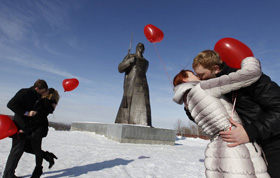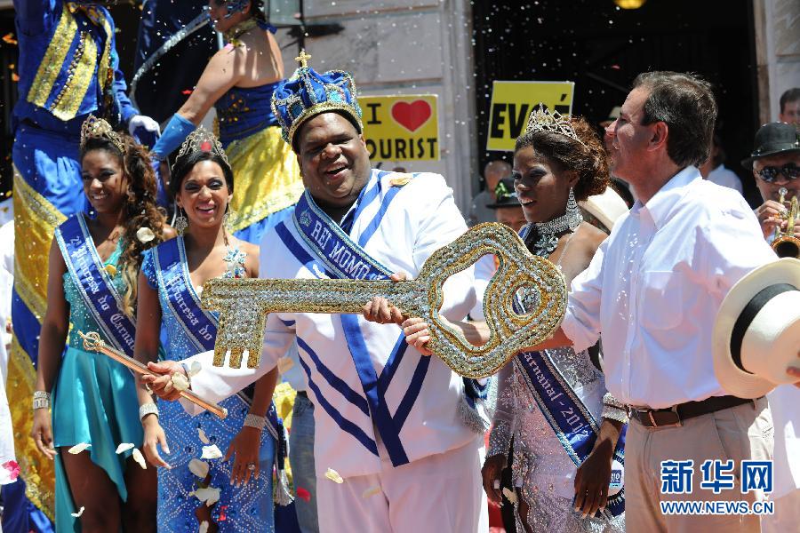 2月17日,巴西里約熱內(nèi)盧市市長埃德華多·帕埃斯(右一)在市政廳前廣場上,將象征管轄權的城門鑰匙交到被稱作“莫莫王”的“狂歡節(jié)國王”(中)手中,標志著2012年里約熱內(nèi)盧狂歡節(jié)拉開帷幕。新華社記者翁忻旸攝