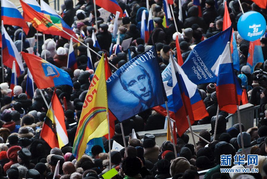 2月23日,俄羅斯總統(tǒng)候選人、現(xiàn)任總理普京的支持者在莫斯科盧日尼基體育場集會。當日是俄羅斯祖國保衛(wèi)者日,莫斯科舉行了三場分別支持俄羅斯總統(tǒng)候選人普京、久加諾夫、日里諾夫斯基的游行集會,為即將到來的3月4日總統(tǒng)大選造勢。新華社記者姜克紅攝