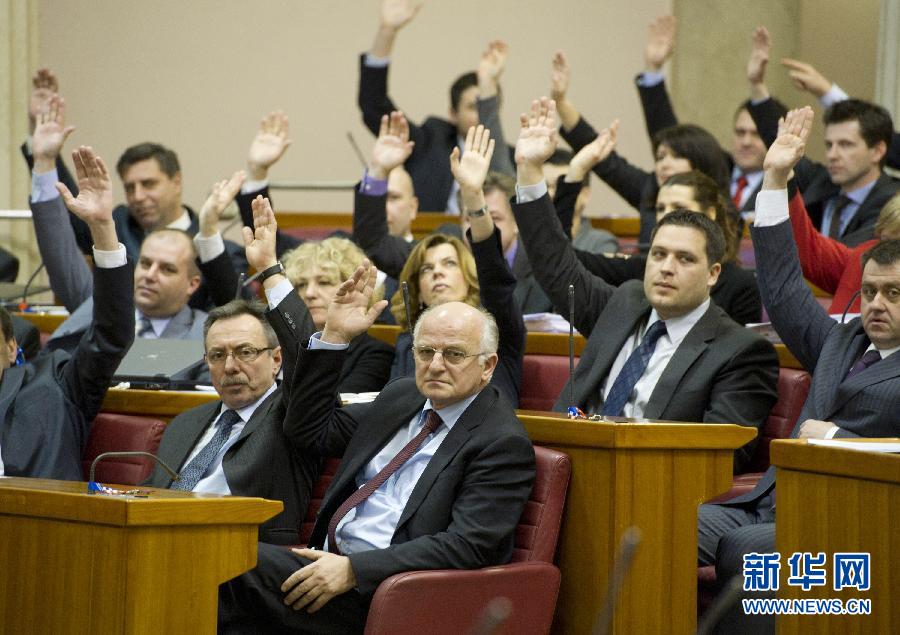 3月9日,在克羅地亞首都薩格勒布,克羅地亞議員就克羅地亞加入歐盟的協(xié)議舉手表決。當(dāng)日,克羅地亞議會(huì)以舉手表決的方式全票通過克羅地亞加入歐盟的協(xié)議?肆_地亞去年12月9日與歐盟正式簽署入盟協(xié)議,并于今年1月獲得全民公決通過。該協(xié)議需要得到歐盟各成員國立法機(jī)構(gòu)逐一批準(zhǔn),迄今已經(jīng)有5個(gè)歐盟成員國批準(zhǔn)了這一協(xié)議。如果一切順利,克羅地亞將在2013年7月1日成為歐盟正式成員。新華社發(fā)(米紹·利沙寧攝)