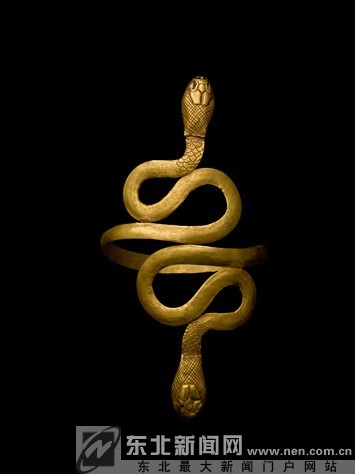 圖為一枚克利奧帕特拉時(shí)代的埃及金手鐲,采用了兩蛇環(huán)繞的構(gòu)型,象征著保護(hù)和重生。