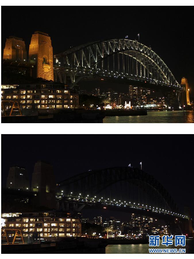 這張上下拼圖顯示的是3月31日晚,澳大利亞的悉尼海港大橋熄燈前后的情景。當(dāng)天,澳大利亞悉尼參與了“地球一小時(shí)”熄燈活動(dòng)。晚上8點(diǎn)30分,悉尼海港大橋以及悉尼歌劇院同時(shí)關(guān)閉了所有的裝飾燈,以響應(yīng)由世界自然基金會(huì)發(fā)起的“地球一小時(shí)”活動(dòng)。新華社記者金林鵬攝