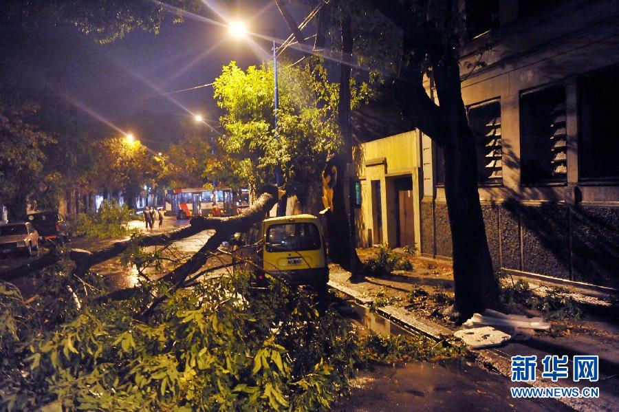 4月4日,在阿根廷首都布宜諾斯艾利斯,被風(fēng)刮倒的大樹橫在路上。布宜諾斯艾利斯當(dāng)天遭暴風(fēng)雨襲擊,大量樹木和廣告牌被刮倒,地鐵運(yùn)行中斷,部分地區(qū)斷電。新華社/美洲通訊社