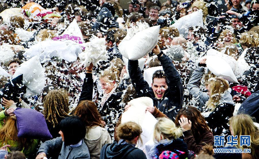 當天,歐洲及美國多個城市上演了一年一度的“枕頭大戰(zhàn)”。這一活動的目的在于讓都市里的人們不要每天坐在電視機或者電腦前,而是到城市中心與其他人接觸。如今,“枕頭大戰(zhàn)”已經(jīng)成為都市人緩解緊張生活節(jié)奏和釋放壓力的一種有趣發(fā)泄方式! ⌒氯A社發(fā)(羅賓·于特雷西特攝)