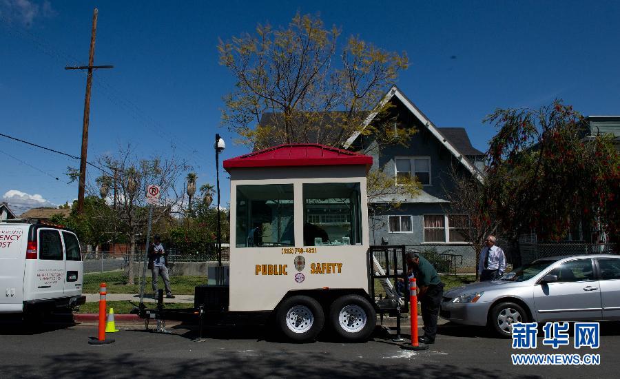 4月11日中午,在美國洛杉磯,安保人員在槍擊案事發(fā)現(xiàn)場安裝移動安保崗?fù)。位于美國洛杉磯南郊的南加州大學(xué)校園附近11日凌晨發(fā)生一起槍擊案,一男一女兩名中國留學(xué)生被槍殺。 新華社記者楊磊攝
