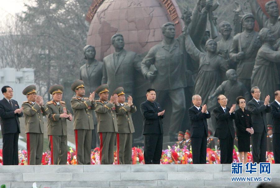 4月13日,在朝鮮平壤,金正恩(中)參加揭幕儀式。當(dāng)日,朝鮮在平壤市中心萬壽臺為金日成、金正日銅像舉行了揭幕儀式。當(dāng)天被推舉為朝鮮國防委員會第一委員長的朝鮮最高領(lǐng)導(dǎo)人金正恩參加。平壤數(shù)十萬群眾到萬壽臺或在大同江對岸觀看儀式,朝鮮中央電視臺對儀式進(jìn)行了現(xiàn)場直播。朝鮮方面還邀請前來采訪“光明星3號”衛(wèi)星發(fā)射的外國媒體記者前往現(xiàn)場拍攝。新華社記者張利攝
