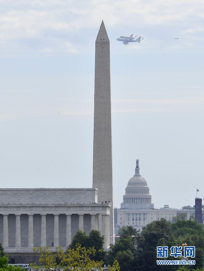 4月17日,“發(fā)現(xiàn)”號航天飛機(jī)從美國首都華盛頓上空飛過。 “發(fā)現(xiàn)”號航天飛機(jī)當(dāng)天告別美國佛羅里達(dá)肯尼迪航天中心,抵達(dá)位于華盛頓附近史密斯航空博物館的新家。 新華社記者張軍攝
