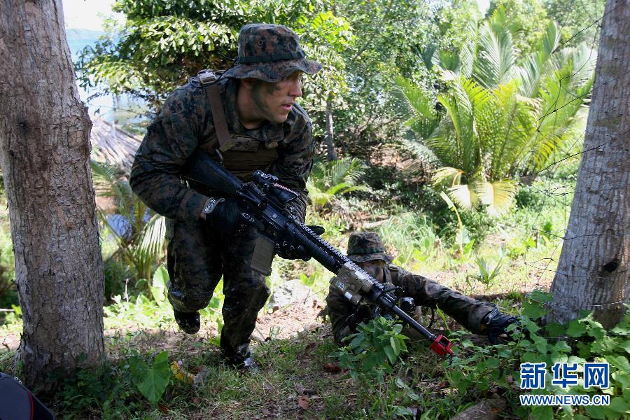4月25日,在菲律賓巴拉望島的烏盧甘灣,士兵們參加聯(lián)合演習(xí)。當(dāng)天,菲律賓和美國(guó)的“肩并肩”聯(lián)合軍演在巴拉望島烏盧甘灣舉行兩棲作戰(zhàn)演習(xí)!凹绮⒓纭睘榉泼滥甓壤熊娧,旨在加強(qiáng)兩國(guó)在應(yīng)對(duì)恐怖主義、海盜、走私及自然災(zāi)害等方面合作。新華社發(fā)(烏馬利攝)
