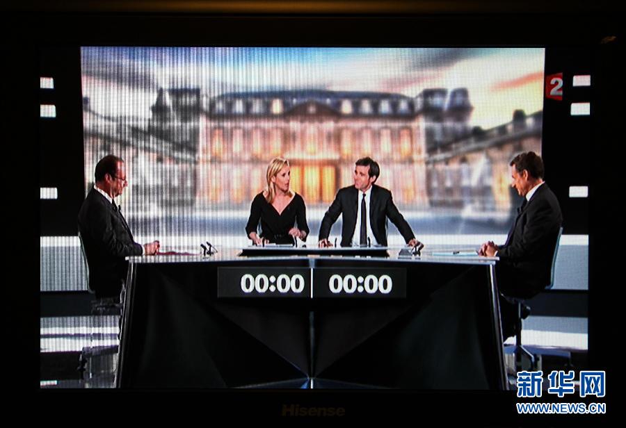 當(dāng)天晚間的電視辯論是奧朗德與薩科齊唯一一次面對面的電視辯論,也是第二輪投票前二人最后一次正面交鋒。對于目前選情落后的薩科齊來說,此次電視辯論是挽回?cái)【值奈ㄒ粰C(jī)會(huì)。新華社記者高靜攝