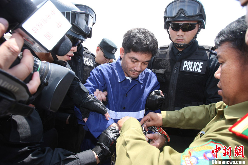 5月10日,萬象機(jī)場(chǎng),老撾警方將“金三角”特大武裝販毒集團(tuán)首犯糯康正式依法移交給中國警方,這是中老緬泰聯(lián)合執(zhí)法取得的又一重大成果。糯康武裝販毒集團(tuán)盤踞于湄公河兩岸,長期從事制販毒品,綁架殺人,搶劫商旅,敲詐勒索,收取保護(hù)費(fèi)等犯罪活動(dòng),成為威脅湄公河流域各國經(jīng)貿(mào)往來和民眾正常生產(chǎn)生活安全的最大禍患對(duì)本地區(qū)人民犯下累累罪行。目前,在中老緬泰四方通力合作下,該團(tuán)伙受到摧毀性打擊,F(xiàn)有證據(jù)表明,糯康及其武裝販毒集團(tuán)與泰國個(gè)別不法軍人勾結(jié)策劃、分工實(shí)施了“10.5”案件。圖為在老撾萬象機(jī)場(chǎng),老方警務(wù)人員將糯康移交給中方警務(wù)人員。中新社發(fā)趙飛攝