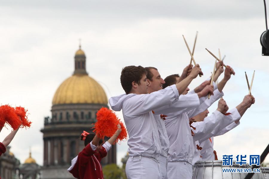 5月13日,鼓手們?cè)谑ケ说帽ざ瑢m前的舞臺(tái)上敲鼓為參賽者助威。當(dāng)日,名為“明星接力賽”的跑步比賽在俄羅斯圣彼得堡市中心舉行。人們通過賽跑形式紀(jì)念蘇聯(lián)衛(wèi)國戰(zhàn)爭(zhēng)勝利67周年,激發(fā)青年人愛國情懷,增強(qiáng)青年體質(zhì)。新華社記者魯金博攝