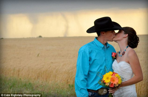 據報道,當日,就在這對戀人互相宣誓結為夫妻之后,他們朝窗外看去,只見龍卷風出現在麥田的另一邊。天上烏云由斗狀云柱與地面接壤,場面尤為壯觀。男方凱勒一點也不慌張,拉著女方坎德爾的手走到室外,以龍卷風為背景,在攝影師的鏡頭下親吻了自己的新娘。