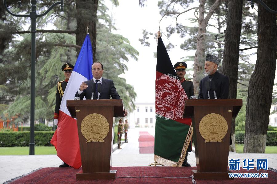 奧朗德當(dāng)天突防阿富汗。這是奧朗德本月就任法國總統(tǒng)后首次訪問阿富汗。奧朗德在與阿富汗總統(tǒng)卡爾扎伊舉行的聯(lián)合新聞發(fā)布會(huì)上說:“2012年底,約有2000名法軍作戰(zhàn)部隊(duì)士兵將啟程回國!彼麖(qiáng)調(diào),到2013年,阿富汗境內(nèi)將不再有法軍作戰(zhàn)部隊(duì)的身影。新華社發(fā)(馬蘇德攝)