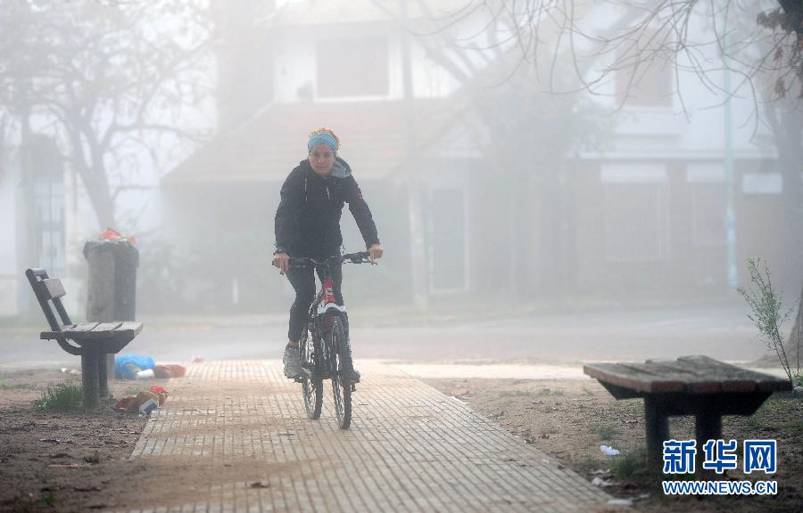 5月28日,在阿根廷首都布宜諾斯艾利斯,一位居民在大霧中騎自行車。布宜諾斯艾利斯和附近地區(qū)當(dāng)天處于大霧籠罩下,機(jī)場(chǎng)所有進(jìn)出港航班停飛,地面交通也陷入混亂,給人們出行帶來極大困擾。新華社/美洲通訊社