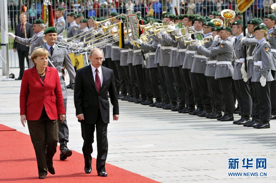 6月1日,在柏林的德國總理府,德國總理默克爾(左)和俄羅斯總統(tǒng)普京在歡迎儀式上檢閱儀仗隊。當(dāng)日,俄羅斯總統(tǒng)普京訪問德國,并與德國總理默克爾在柏林舉行會談和聯(lián)合新聞發(fā)布會。 新華社記者 馬寧 攝