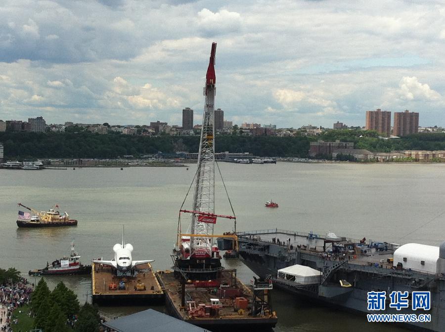 6月6日,在美國紐約86號碼頭,“企業(yè)”號航天飛機停放在“無畏”號航空母艦旁邊。當天,“企業(yè)”號航天飛機正式落戶無畏?詹┪镳^!捌髽I(yè)”號航天飛機是美國航天飛機計劃中第一架原型機,它一直被用來進行重返地球測試,從未進入過太空。美國航天局去年將其航天飛機機隊退役,集中精力發(fā)展可超越近地軌道的下一代太空飛船。 新華社記者伍婧丹攝