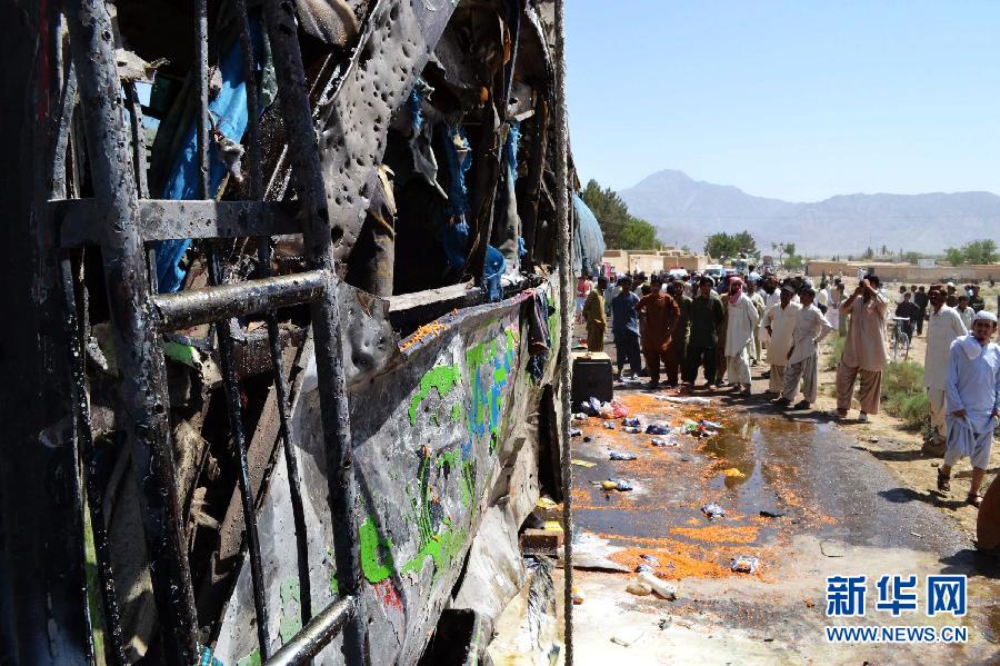 6月11日,在巴基斯坦西南部俾路支省默斯東地區(qū)的爆炸現(xiàn)場,當?shù)厝藝^被毀車輛。據(jù)巴基斯坦媒體11日報道,一輛客車當天上午在巴基斯坦西南部俾路支省遭炸彈襲擊,造成至少6人死亡,40多人受傷。 新華社發(fā)(穆罕默德攝)