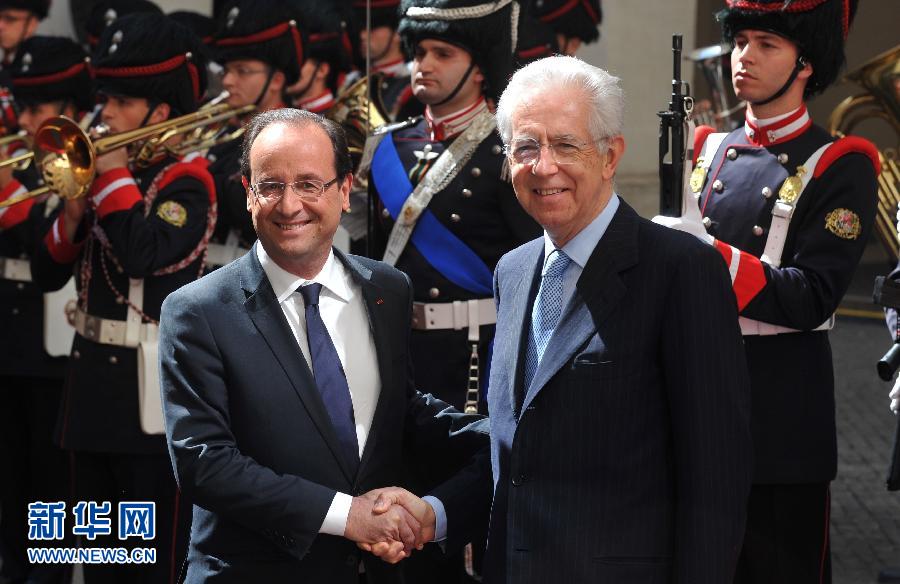 6月14日,在意大利首都羅馬,意大利總理蒙蒂(右)歡迎到訪的法國總統(tǒng)奧朗德。 當(dāng)天是法國總統(tǒng)奧朗德就任后首次訪問意大利。新華社記者王慶欽攝