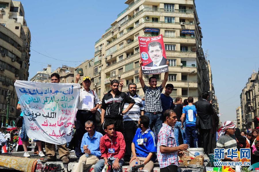 6月18日,埃及總統(tǒng)候選人穆?tīng)栁鞯闹С终咴谑锥奸_(kāi)羅解放廣場(chǎng)舉行慶;顒(dòng)。埃及穆斯林兄弟會(huì)(穆兄會(huì))當(dāng)?shù)貢r(shí)間18日凌晨召開(kāi)新聞發(fā)布會(huì),宣布其麾下候選人穆?tīng)栁髟诘诙喛偨y(tǒng)選舉中獲勝。不過(guò),其競(jìng)爭(zhēng)對(duì)手、沙菲克的競(jìng)選團(tuán)隊(duì)對(duì)穆?tīng)栁鲉畏矫嫘极@勝表示質(zhì)疑。新華社記者覃海石攝