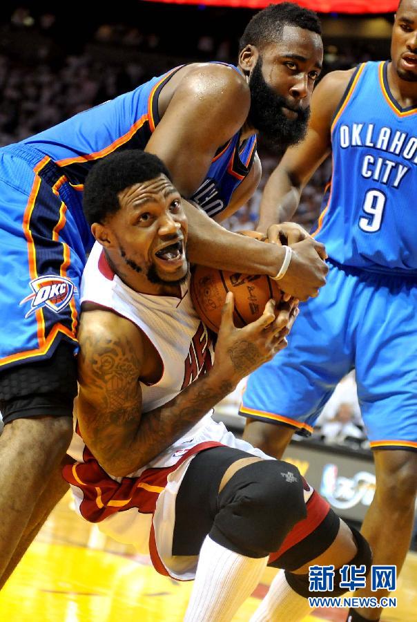 6月19日,熱火隊球員哈斯勒姆(下)與雷霆隊員哈登(左上)拼搶。當(dāng)日,在2011-2012賽季NBA總決賽第四場比賽中,邁阿密熱火隊主場以104比98戰(zhàn)勝俄克拉荷馬雷霆隊。邁阿密熱火隊目前以3比1的總比分領(lǐng)先。新華社記者王雷攝