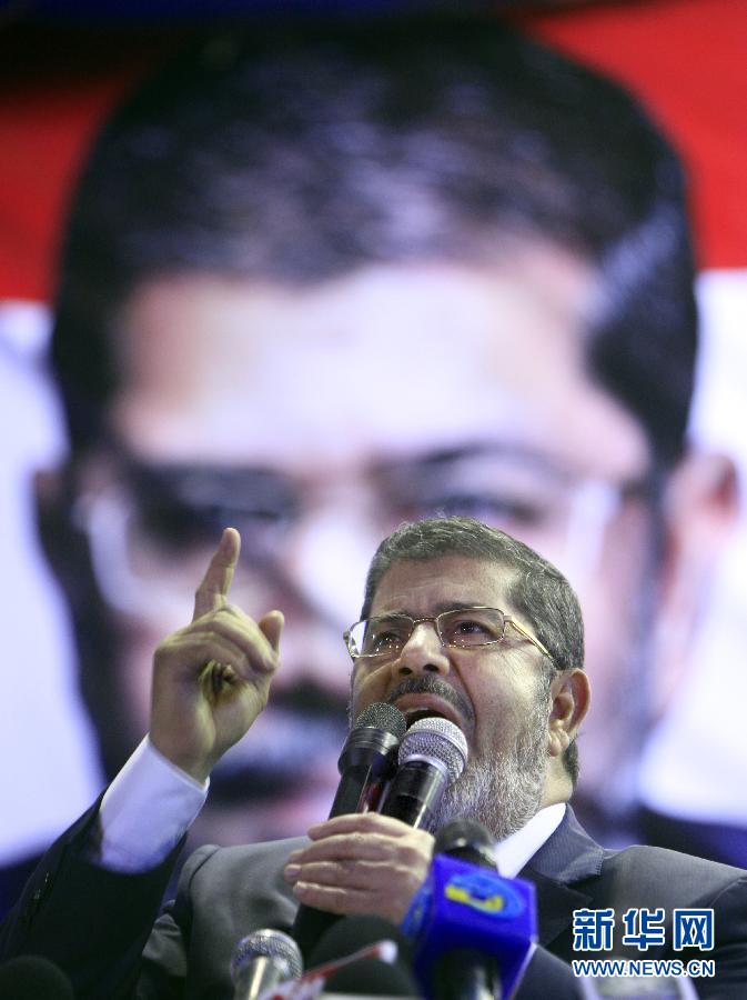 6月24日,埃及最高總統(tǒng)選舉委員會(huì)宣布,穆斯林兄弟會(huì)下屬自由與正義黨主席穆?tīng)栁髭A得穆巴拉克下臺(tái)后的首次埃及民主總統(tǒng)大選。圖為2012年4月30日在開(kāi)羅拍攝的穆?tīng)栁鞯馁Y料照片。 新華社/美聯(lián)