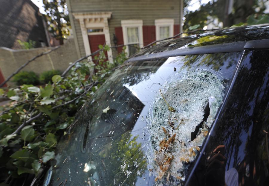 新華社照片,華盛頓,2012年6月30日 (國際)(3)美國東部遭受暴風(fēng)雨襲擊6月30日,在美國首都華盛頓,一輛汽車的擋風(fēng)玻璃被樹砸壞! “ㄊ锥既A盛頓在內(nèi)的美國東部多個地區(qū)29日晚至30日早遭遇暴風(fēng)雨天氣,造成3人死亡和大面積斷電,預(yù)計超過200萬人受到影響。新華社記者張軍攝