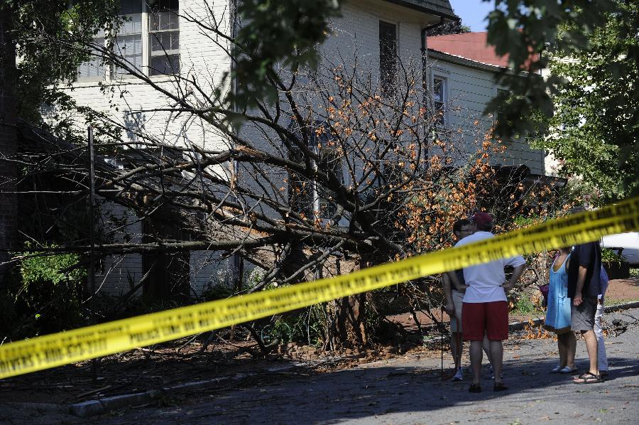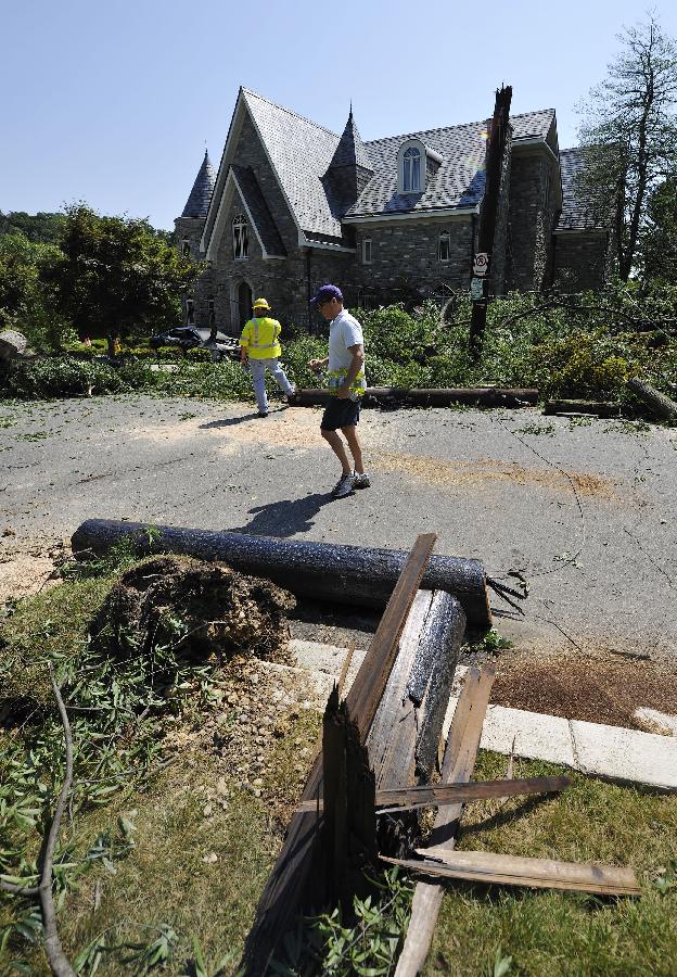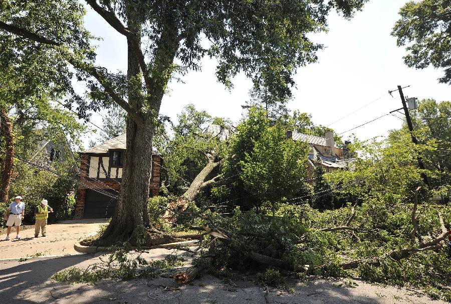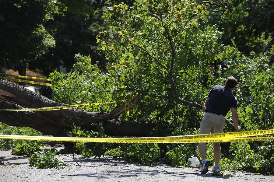 新華社照片,華盛頓,2012年6月30日 (國際)(4)美國東部遭受暴風(fēng)雨襲擊 6月30日,在美國首都華盛頓,居民查看被風(fēng)吹倒的大樹! “ㄊ锥既A盛頓在內(nèi)的美國東部多個地區(qū)29日晚至30日早遭遇暴風(fēng)雨天氣,造成3人死亡和大面積斷電,預(yù)計超過200萬人受到影響。新華社記者張軍攝