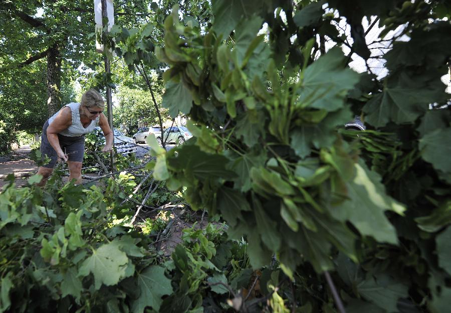 新華社照片,華盛頓,2012年6月30日 (國際)(5)美國東部遭受暴風(fēng)雨襲擊6月30日,在美國首都華盛頓,一名當(dāng)?shù)鼐用袂謇肀槐╋L(fēng)雨吹落的樹枝。 包括首都華盛頓在內(nèi)的美國東部多個地區(qū)29日晚至30日早遭遇暴風(fēng)雨天氣,造成3人死亡和大面積斷電,預(yù)計超過200萬人受到影響。新華社記者張軍攝