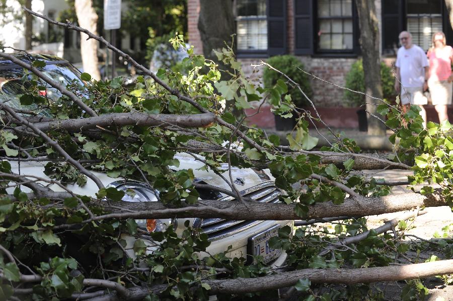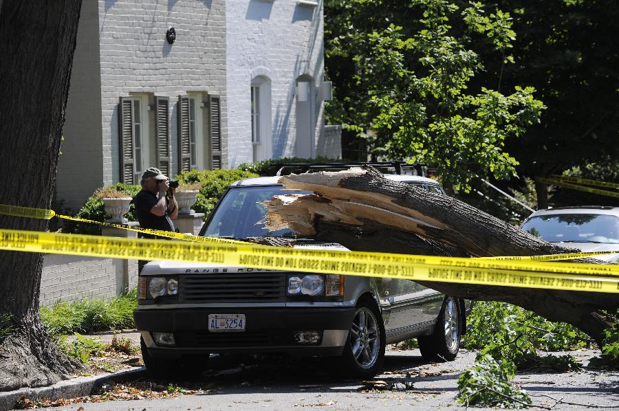 新華社照片,華盛頓,2012年6月30日 (國際)(6)美國東部遭受暴風(fēng)雨襲擊 6月30日,在美國首都華盛頓,一輛汽車被樹枝砸中! “ㄊ锥既A盛頓在內(nèi)的美國東部多個地區(qū)29日晚至30日早遭遇暴風(fēng)雨天氣,造成3人死亡和大面積斷電,預(yù)計超過200萬人受到影響。新華社記者張軍攝