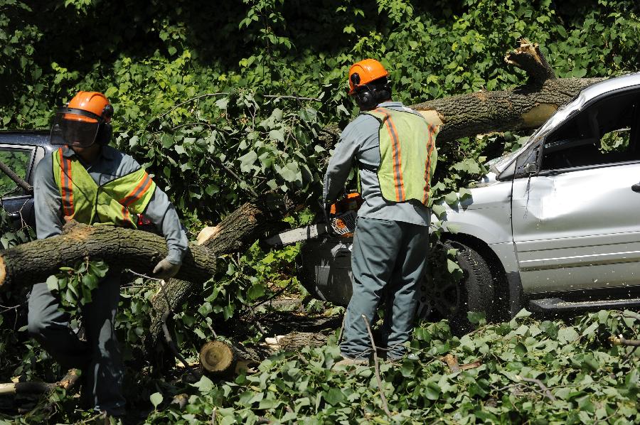 新華社照片,華盛頓,2012年6月30日 (國際)(9)美國東部遭受暴風(fēng)雨襲擊6月30日,在美國首都華盛頓,工人清理在暴風(fēng)雨中被風(fēng)吹倒的大樹! “ㄊ锥既A盛頓在內(nèi)的美國東部多個地區(qū)29日晚至30日早遭遇暴風(fēng)雨天氣,造成3人死亡和大面積斷電,預(yù)計超過200萬人受到影響。新華社記者張軍攝