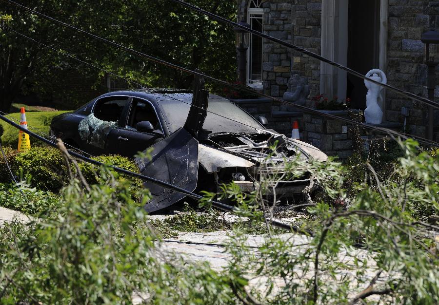 新華社照片,華盛頓,2012年6月30日 (國際)(10)美國東部遭受暴風(fēng)雨襲擊6月30日,在美國首都華盛頓,一輛汽車在暴風(fēng)雨中遭到嚴(yán)重?fù)p壞! “ㄊ锥既A盛頓在內(nèi)的美國東部多個地區(qū)29日晚至30日早遭遇暴風(fēng)雨天氣,造成3人死亡和大面積斷電,預(yù)計超過200萬人受到影響。新華社記者張軍攝